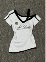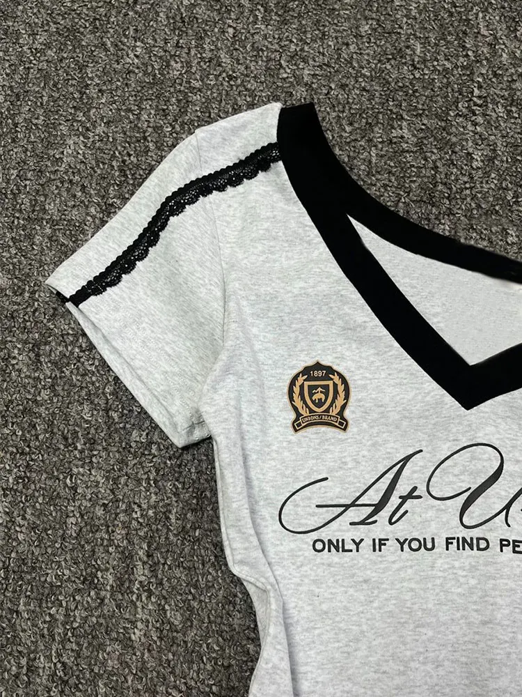 White-Gray Lace Sport Sexy Summer Off shoulder Top Women Y2k V neck Short sleeve T shirt Fashion Korean Lady Basic Tees 2025 New